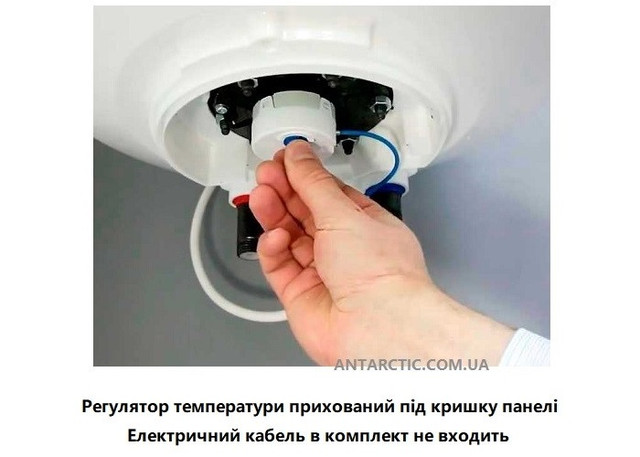 Термостат із захистом від перегрівання. Регулятор температури прихований під нижньою кришкою, режим роботи позначений світловим індикатором. Патрубок забору гарячої води зроблений із нержавіючої сталі. Бойлер без термометра.